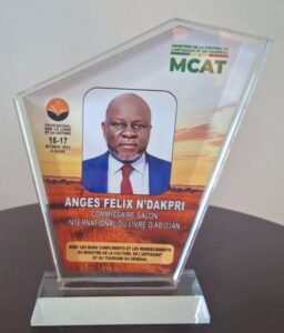 Au cours de la cérémonie officielle, le Ministère de la Culture, de l’Artisanat et du Tourisme du Sénégal (MCAT) a remis à M. Anges Félix N’Dakpri une distinction honorifique pour son engagement exceptionnel dans la promotion du livre, de la lecture et des industries culturelles africaines.